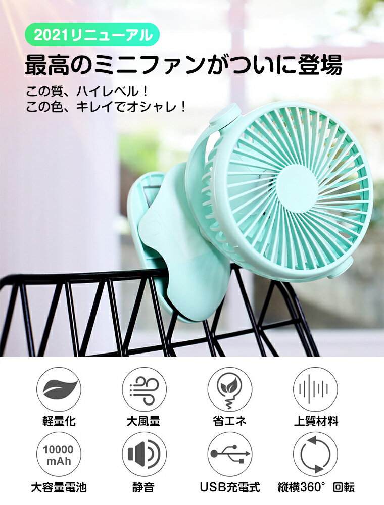 即納 P10倍「母の日 早割」【10000mAh大容量 最大34H連続作動】卓上扇風機 ベビーカー 首振り 超静音 ハンディファン 携帯扇風機 車載用 クリップ 扇風機 USB充電式 ハンディ ミニ扇風機 360°可調節 低騒音 軽量 チャイルドシート 4段階風量調節 母の日ギフト 送料無料